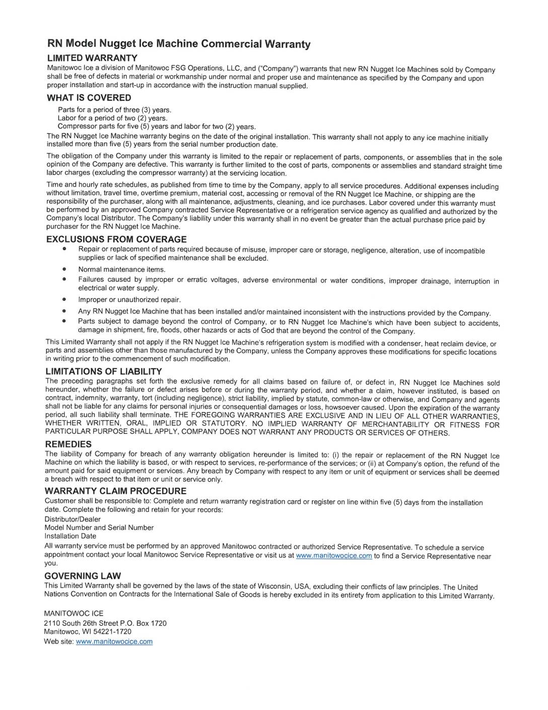 Compressor parts for 5 years and labor for 2 years - Ice Production:
